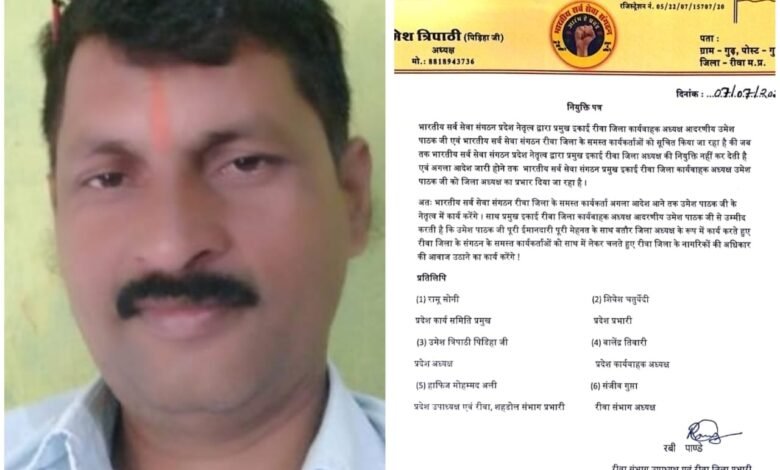 भारतीय सर्व सेवा संगठन रीवा संभागीय उपाध्यक्ष एवं रीवा जिला प्रभारी रवि पांडे द्वारा संगठन के सभी वरिष्ठ पदाधिकारी के सहमति से नियुक्ति पत्र के माध्यम से उमेश पाठक को प्रमुख इकाई रीवा जिला अध्यक्ष का दिया प्रभार