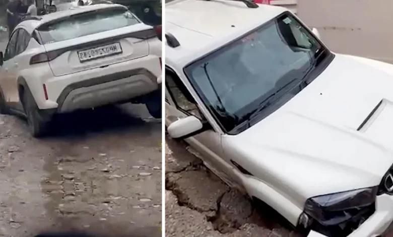 चलती कारें गड्ढों में फंसी, क्रेन से बाहर निकाली गईं